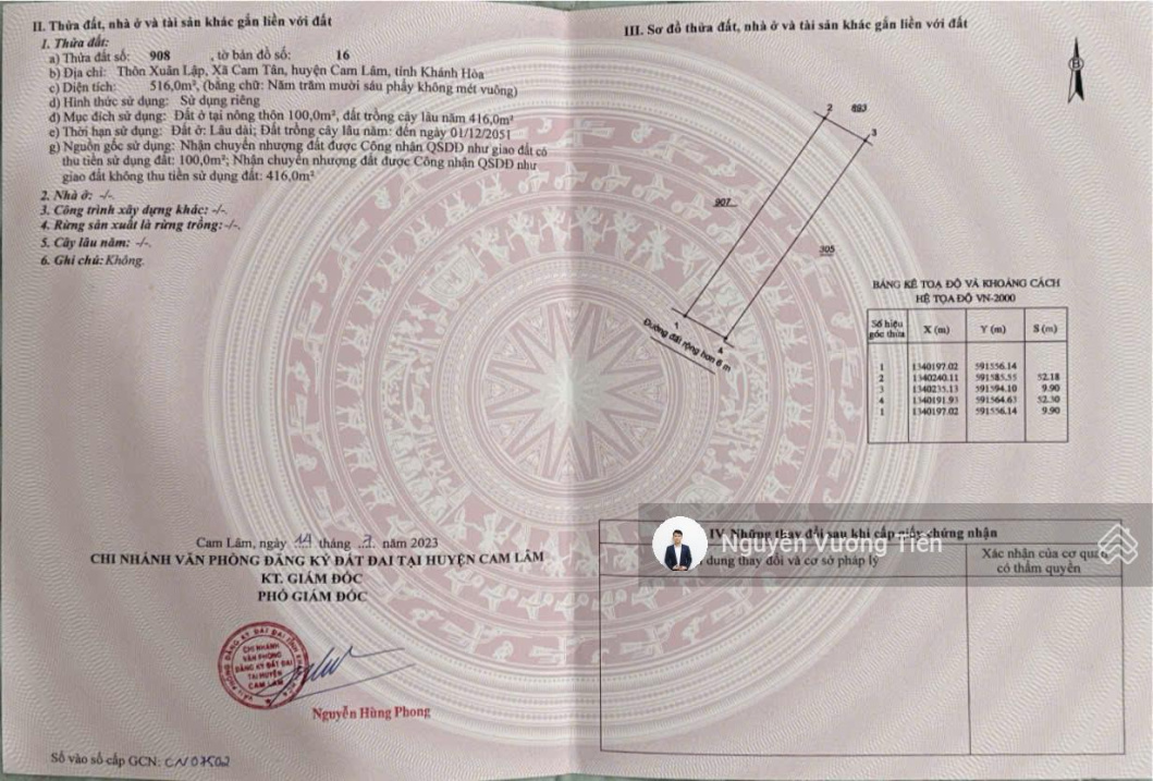 3,7 triệu/m² đất thôn Xuân Lập Cam Tân 516m² có 100m2 thổ, đường nhựa 2 ô tô