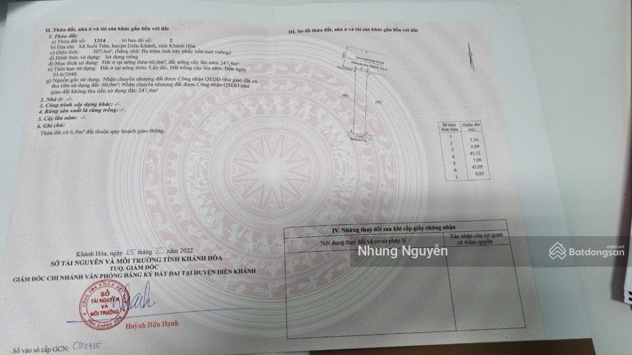 Đất Suối Tiên Diên Khánh cạnh HL39. Diện tích: 307.4m² 60m² thổ cư ngang 7m. Vị trí đẹp: Đường nhựa hiện trạng 6.3m, quy hoạch mở rộng 15m