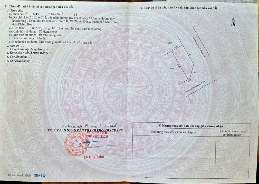 Bán đất, góc 2 đường 17,5m và 13,5m, TĐC Hòn Rớ 2 Phước Đồng cũ, Nha Trang, Khánh Hòa.Diện tích: 83,5 m² ngang 6m x 16m. Hướng: Đông nam