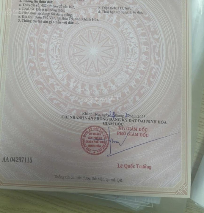 Đất nền với diện tích 113m² nằm tại Thôn Phú Văn, Xã Hòa Trí, Khánh Hòa cũ: Thị xã Ninh Hòa, Khánh Hòa. Hướng cửa chính: Bắc. Giá bán: 450 triệu VND