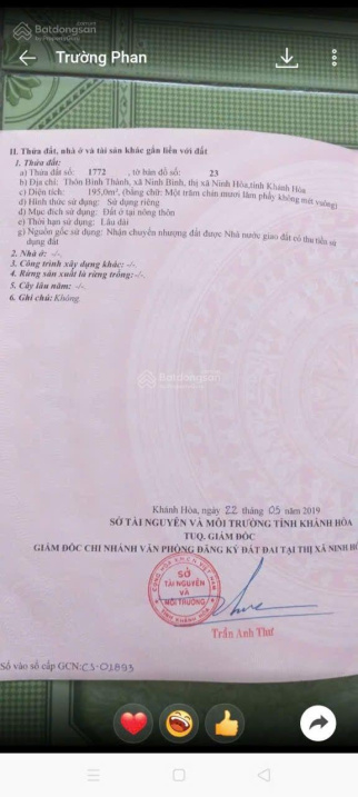 Đất nền bán tại Xã Ninh Bình, Ninh Hòa, Khánh Hòa với diện tích 195 m², giá 1,5 tỷ VND. Mặt tiền rộng 13m, đường vào 5m, thuận tiện cho việc xây dựng nhà ở hoặc đầu tư kinh doanh