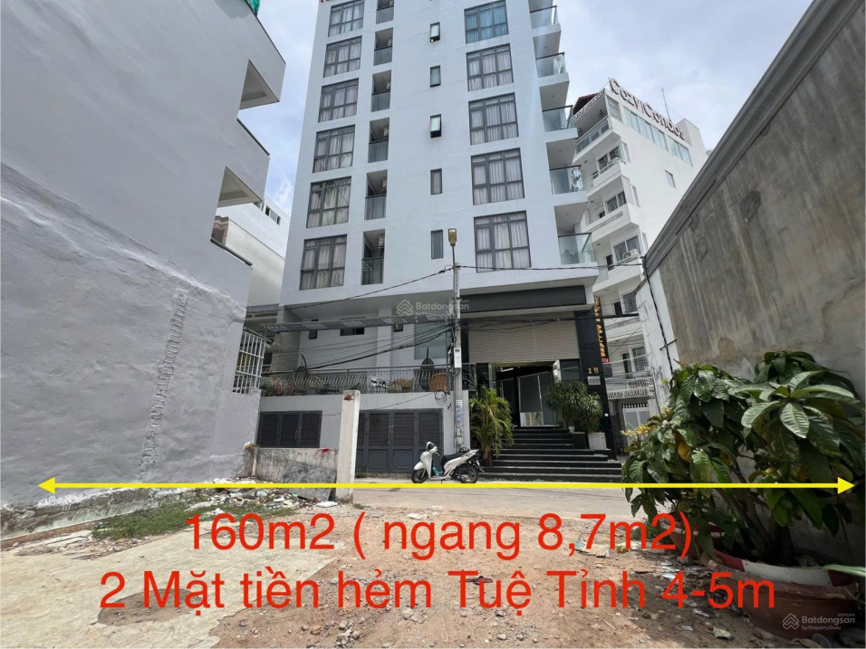 Siêu phẩm 8,7 mét ngang đất 2 mặt tiền hẻm Tuệ Tĩnh khu phố Tây, gần biển TP Nha Trang giá chỉ: 21,5tỷ 135 triệu/m² thương lượng.Thông tin chi tiết: Diện tích: 160m² ngang 8,7m vuông vức, đẹp chuẩn xây dựng