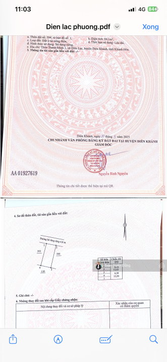 Bán đất Diên Lạc Diên Khánh | có sổ riêng.Vị trí: Thôn Thanh Minh 1, xã Diên Lạc, huyện Diên Khánh, Khánh Hòa.Diện tích: 84,1 m².Pháp lý: Sổ hồng riêng, sử dụng lâu dài