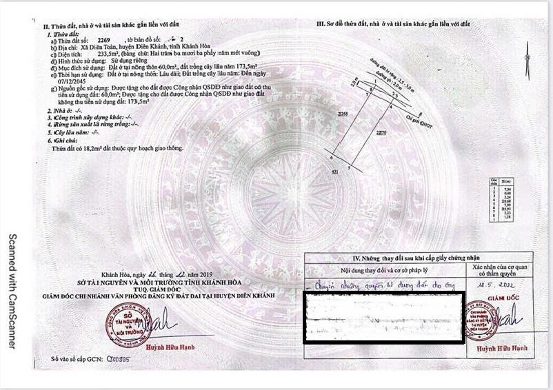 Chính chủ gửi đất Phước Trạch, Xã Diên Khánh. DT: 233,5m², 60 thổ cư Ngang 8m, sau QH: 215m². Giá bán: 1 tỷ 990 chỉ bớt lộc, bao ra sổ