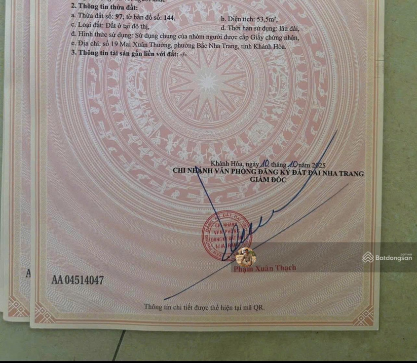 Chính chủ nhờ bán lô đất hẻm Mai Xuân Thưởng, Phường Bắc Nha Trang. Diện tích: 53,5m² ngang 5.4m. Hướng: Tây. Pháp lý: Sổ hồng. Vị trí: Lô đất cách đường chính Mai Xuân Thưởng 20m, xe ô tô đi vào quay đầu thoả mái, gần trường học, chợ, Bách Hoá Xanh