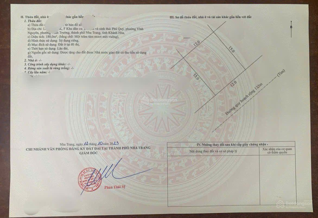 Duy nhất một lô 180m² KĐT biển An Viên Nha Trang, hướng đông sát Vinpearl Phú Quý. Diện tích: 180m², ngang 12m. Hướng Đông. Đường nhựa rộng 13,5m