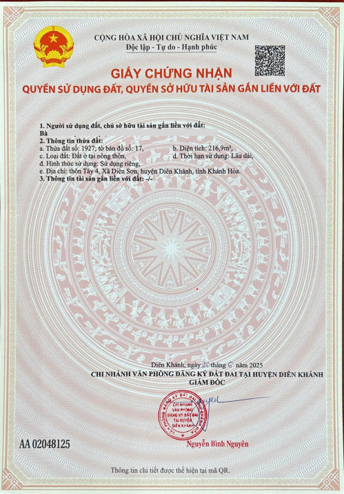 Lô đất mặt tiền Xóm Gò 7 Diên Sơn Diên Khánh DT 216.9m².+ Vị trí lô đất cách đường Nhà Vuông chỉ 1km.+ Khu đông dân cư, đầy đủ tiện ích, đường nhựa hiện trạng 2 ô tô né nhau